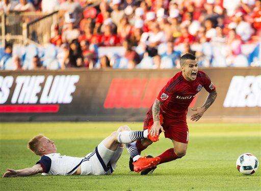 Real Salt Lake defender Justen Glad (15) trips up Toronto FC forward Sebastian Giovinco (10) during first half MLS soccer action in Toronto on Wednesday, Aug. 3, 2016. (Nathan Denette/The Canadian Press via AP)