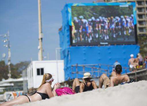 Spectators watch from Copacabana beach as the men's cycling road race final is broadcast on a screen ahead of its arrival at the finish line nearby in Rio de Janeiro, Brazil, Saturday, Aug. 6, 2016. (AP Photo/David Goldman) The Associated Press