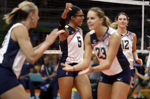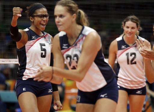 United States' Jordan Larson, left, Rachael Adams (5), Kelsey Robinson (23) and Kelly Murphy, right, celebrate during a women's preliminary volleyball match against Puerto Rico at the 2016 Summer Olympics in Rio de Janeiro, Brazil, Saturday, Aug. 6, 2016. (AP Photo/Matt Rourke)