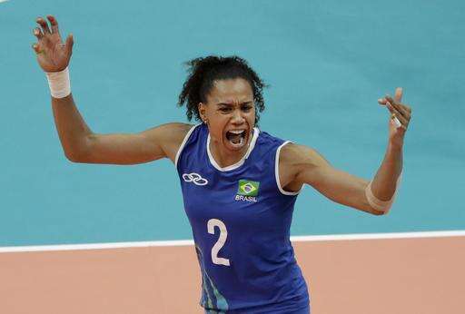 Brazil's Fernanda Rodrigues celebrates during a women's preliminary volleyball match against Cameroon at the 2016 Summer Olympics in Rio de Janeiro, Brazil, Saturday, Aug. 6, 2016. (AP Photo/Matt Rourke)