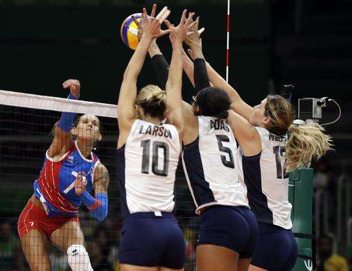 Puerto Rico's Stephanie Enright, left, has a shot blocked by United States' Jordan Larson (10), Rachael Adams (5) and Kelly Murphy, right, during a women's preliminary volleyball match at the 2016 Summer Olympics in Rio de Janeiro, Brazil, Saturday, Aug. 6, 2016. (AP Photo/Matt Rourke)