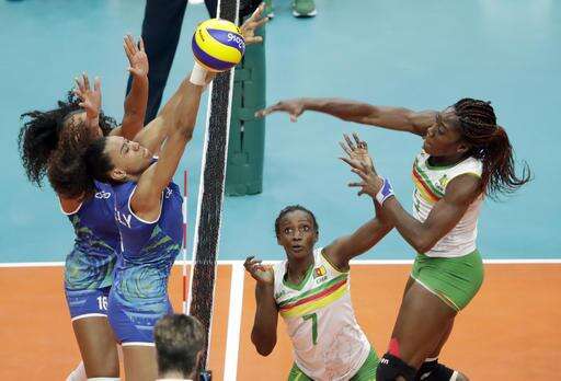 Juciely Cristina Barreto, left, blocks a spike by Cameroon's Theorine Christelle Aboa Mbeza, right, as Cameroon's Henriette Nadege Koulla (7) watches during a women's preliminary volleyball match at the 2016 Summer Olympics in Rio de Janeiro, Brazil, Saturday, Aug. 6, 2016. (AP Photo/Matt Rourke)