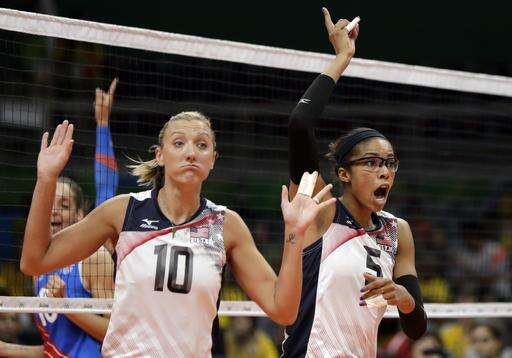 United States' Jordan Larson, left, and Rachael Adams react during a women's preliminary volleyball match against Puerto Rico at the 2016 Summer Olympics in Rio de Janeiro, Brazil, Saturday, Aug. 6, 2016. (AP Photo/Matt Rourke)