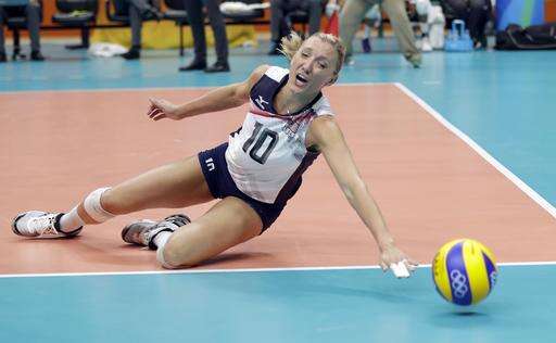 United States' Jordan Larson dives for the ball during a women's preliminary volleyball match against Puerto Rico at the 2016 Summer Olympics in Rio de Janeiro, Brazil, Saturday, Aug. 6, 2016. (AP Photo/Matt Rourke)