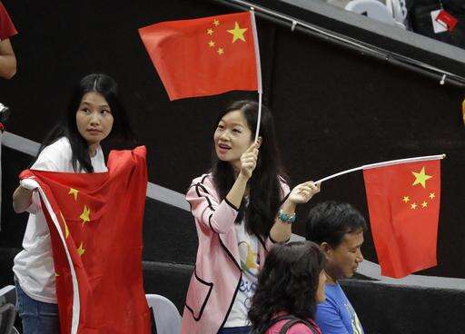 Fans wave China's flag during a women's preliminary volleyball match between the Netherlands and China at the 2016 Summer Olympics in Rio de Janeiro, Brazil, Saturday, Aug. 6, 2016. (AP Photo/Jeff Roberson)