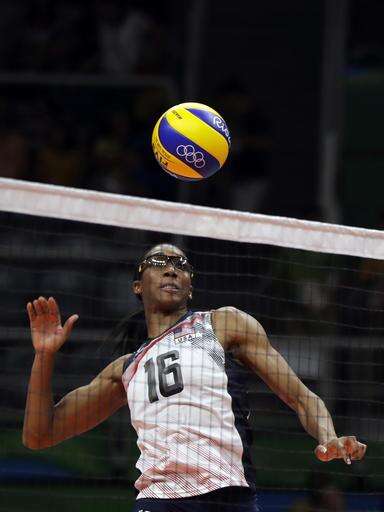 United States' Foluke Akinradewo spikes the ball during a women's preliminary volleyball match against Puerto Rico at the 2016 Summer Olympics in Rio de Janeiro, Brazil, Saturday, Aug. 6, 2016. (AP Photo/Matt Rourke)