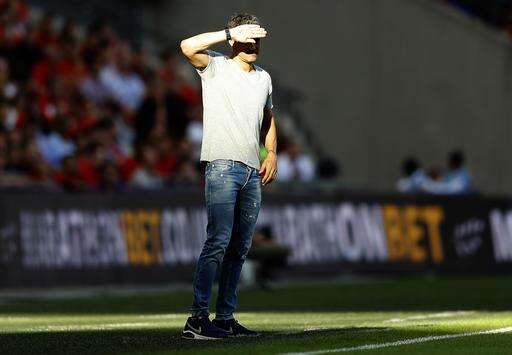 Barcelona's head coach Luis Enrique Martinez gestures, during the International Champions Cup soccer match between Liverpool and Barcelona at Wembley stadium in London, Saturday, Aug. 6, 2016 . (AP Photo/Frank Augstein) The Associated Press