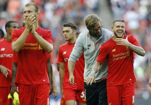 Liverpool's head coach Juergen Klopp, second right, and Liverpool's Alberto Moreno react after winning the International Champions Cup soccer match between Liverpool and Barcelona at Wembley stadium in London, Saturday, Aug. 6, 2016 . (AP Photo/Frank Augstein) The Associated Press