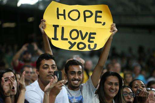 A fan of United States' goalkeeper Hope Solo, holds a sign that reads "Hope, I Love You" during a group G match of the women's Olympic football tournament between United States and France at the Mineirao stadium in Belo Horizonte, Brazil, Saturday, Aug. 6, 2016. United States won 1-0. (AP Photo/Eugenio Savio) The Associated Press