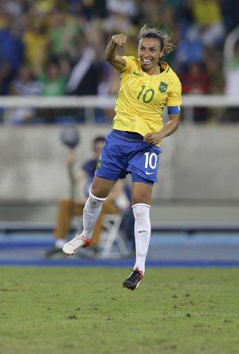 Brazil's Marta celebrates scoring her side's fourth goal during a group E match of the women's Olympic football tournament between Sweden and Brazil at the Rio Olympic Stadium in Rio De Janeiro, Brazil, Saturday, Aug. 6, 2016. (AP Photo/Leo Correa) The Associated Press