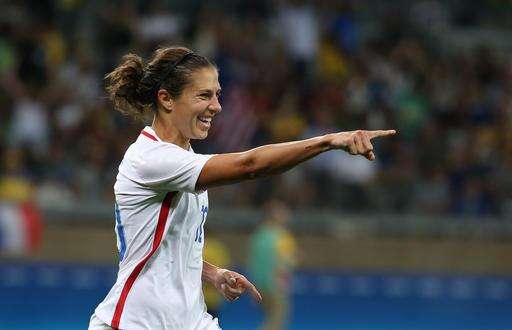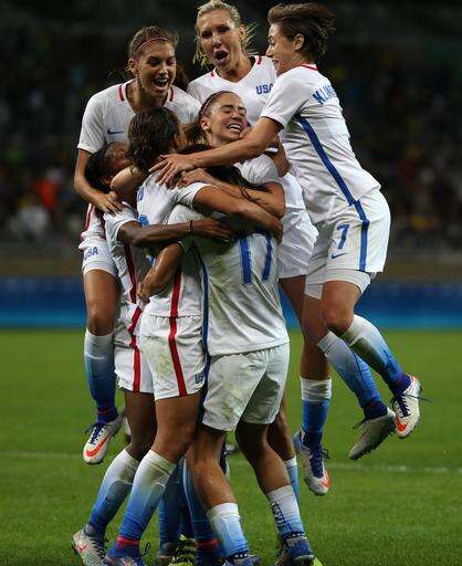 Women's Olympic Football team celebrate their first goal during a group G match of the women's Olympic football tournament between United States and France at the Mineirao stadium in Belo Horizonte, Brazil, Saturday, Aug. 6, 2016. (AP Photo/Eugenio Savio) The Associated Press