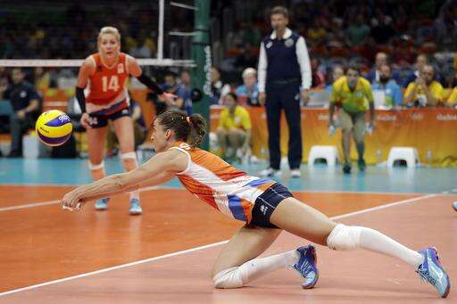 Netherlands' Myrthe Schoot dives for the ball during a women's preliminary volleyball match against the United States at the 2016 Summer Olympics in Rio de Janeiro, Brazil, Monday, Aug. 8, 2016. (AP Photo/Matt Rourke) The Associated Press