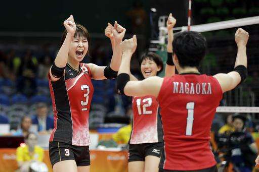 Japan's Saori Kimura (3), Yuki Ishii (12), and Miyu Nagaoka (1) celebrate during a Women's preliminary volleyball match against Cameroon at the 2016 Summer Olympics in Rio de Janeiro, Brazil, Monday, Aug. 8, 2016. (AP Photo/Matt Rourke) The Associated Press