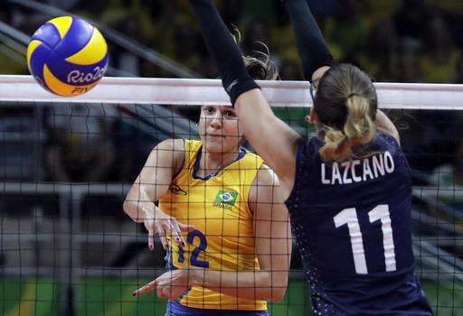 Brazil's Natalia Pereira, left, spikes the ball over Argentina's Julieta Constanza Lazcano during a women's preliminary volleyball match at the 2016 Summer Olympics in Rio de Janeiro, Brazil, Monday, Aug. 8, 2016. (AP Photo/Jeff Roberson) The Associated Press