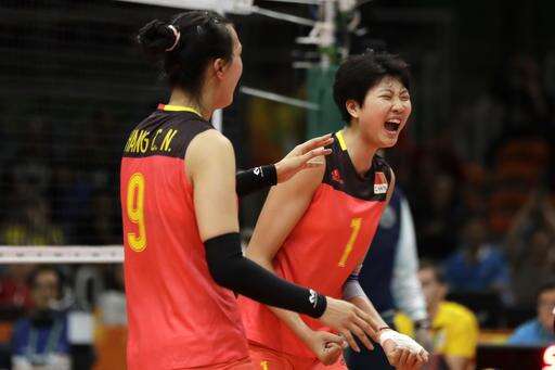 China's Zhang Changning (9) and Yuan Xinyue (1) celebrate during a Women's preliminary volleyball match against Italy at the 2016 Summer Olympics in Rio de Janeiro, Brazil, Monday, Aug. 8, 2016. (AP Photo/Matt Rourke) The Associated Press