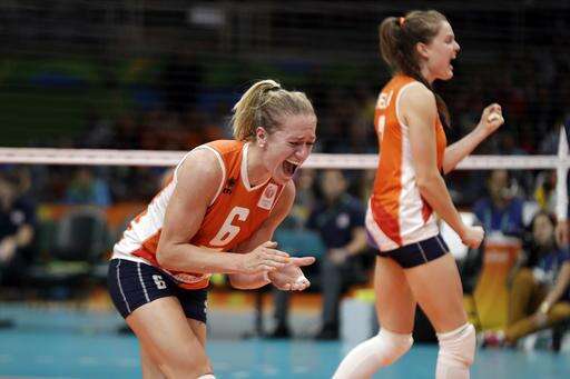 Netherlands' Maret Balkestein-Grothues (6) and Yvon Belien right, celebrate during a Women's preliminary volleyball match against the United States at the 2016 Summer Olympics in Rio de Janeiro, Brazil, Monday, Aug. 8, 2016. (AP Photo/Matt Rourke) The Associated Press