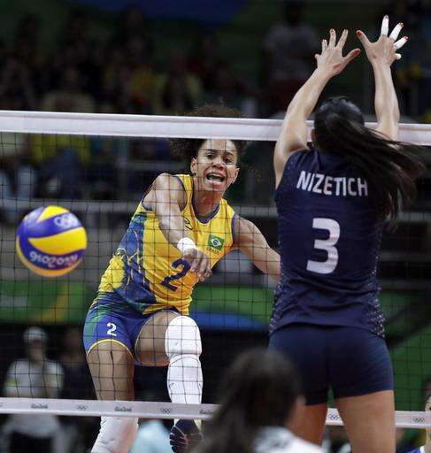 Brazil's Juciely Cristina Barreto, left, spikes the ball past Argentina's Paula Yamila Nizetich during a women's preliminary volleyball match at the 2016 Summer Olympics in Rio de Janeiro, Brazil, Monday, Aug. 8, 2016. (AP Photo/Jeff Roberson) The Associated Press