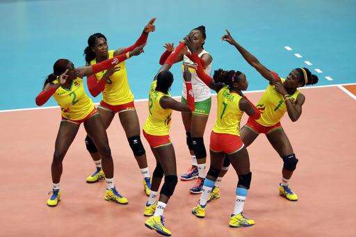 Team Cameroon celebrates during a Women's preliminary volleyball match against Japan at the 2016 Summer Olympics in Rio de Janeiro, Brazil, Monday, Aug. 8, 2016. (AP Photo/Matt Rourke) The Associated Press