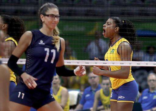 Brazil's Fernanda Rodrigues, right, celebrates along side Argentina's Julieta Constanza Lazcano during a women's preliminary volleyball match at the 2016 Summer Olympics in Rio de Janeiro, Brazil, Monday, Aug. 8, 2016. (AP Photo/Jeff Roberson) The Associated Press