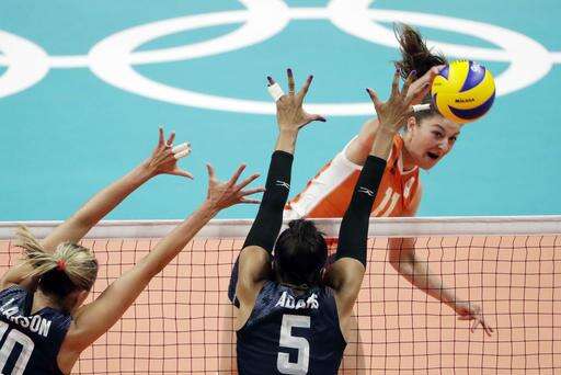 Netherlands' Anne Buijs, right, spikes the ball past United States' Jordan Larson, left, and Rachael Adams (5) during a Women's preliminary volleyball match at the 2016 Summer Olympics in Rio de Janeiro, Brazil, Monday, Aug. 8, 2016. (AP Photo/Matt Rourke) The Associated Press
