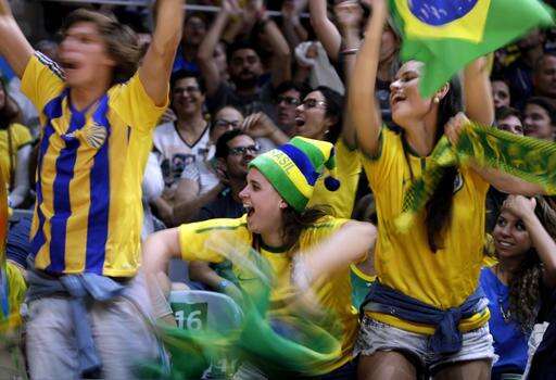 Brazil fans cheer during a women's preliminary volleyball match between Argentina and Brazil at the 2016 Summer Olympics in Rio de Janeiro, Brazil, Monday, Aug. 8, 2016. (AP Photo/Jeff Roberson) The Associated Press