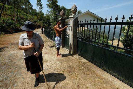 A young man sprays water on a property to protect it from sparks flying from a wildfire nearby in Quintela, near Arouca, in the region of Aveiro, northern Portugal, Tuesday Aug. 9 2016. The National Civil Protection Service said some 2,900 firefighters were in action Tuesday fighting dozens of fires. The worst-hit areas were in northern Portugal, where temperatures have exceeded 30 degrees Celsius (86 Fahrenheit) since Saturday. (AP Photo/Sergio Azenha) The Associated Press
