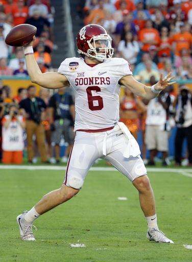 FILE - In this Dec. 31, 2015, file photo, Oklahoma quarterback Baker Mayfield looks to pass during the first half of the Orange Bowl NCAA college football semifinal playoff game against Clemson, in Miami Gardens, Fla. The pool of candidates for the Heisman Trophy is deep. Stanford's Christian McCaffrey and Clemson's Deshaun Watson are among the obvious ones, and Mayfield could enter the race if things break right for him. (AP Photo/Lynne Sladky, File) The Associated Press