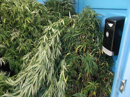This photo provided by Rogue River Police Dept., shows marijuana plants inside a portable toilet. Police in the southern Oregon community of Rogue River say a man walking through a park discovered a portable toilet filled with marijuana plants.The agency posted a photo on social media Wednesday, Aug. 10, 2016, saying it's the largest seizure of pot the department has ever made. Marijuana grows are common in southern Oregon, which has some of the nation's best conditions for outdoor cultivation. (Ken Lewis/Rogue River Police Dept. via AP)
