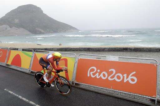 Under dark skies, the cyclists faced lashing rain and wind on the time-trial course along Rio's southern coast. The conditions might have cost Ellen van Dijk of the Netherlands a medal. She slid off the road and got tangled in weeds before finishing fourth.