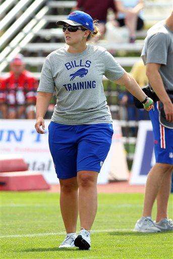 FILE - In this July 31, 2016, file photo, Buffalo Bills quality control-special teams coach Kathryn Smith works with players during NFL football training camp in Pittsford, N.Y. Shy, reserved and unaccustomed to the spotlight, Smith has difficulty putting into perspective what it's like to be the NFL's first female assistant coach and the nationwide publicity she has drawn, including catching the attention of Chelsea Clinton on Twitter. And yet, there is one thing the Bills coach is sure of: It won't be long, Smith says, before other women join her on the sidelines. (AP Photo/Bill Wippert, File) The Associated Press
