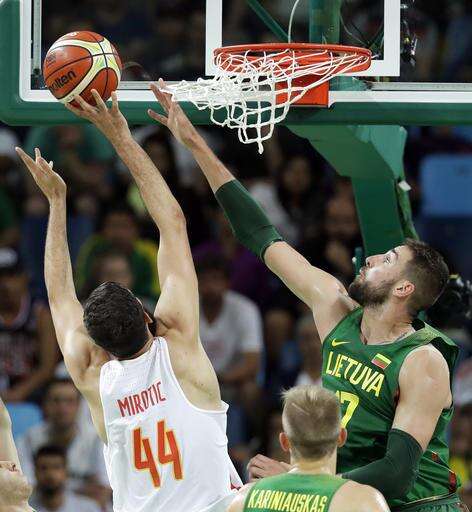 Lithuania's Jonas Valanciunas, right, tries to block a shot by Spain's Nikola Mirotic (44) during a basketball game at the 2016 Summer Olympics in Rio de Janeiro, Brazil, Saturday, Aug. 13, 2016. (AP Photo/Charlie Neibergall)