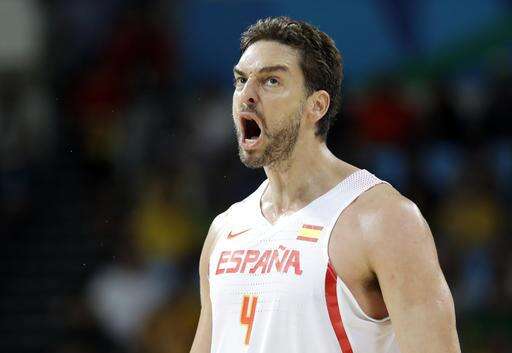 Spain's Pau Gasol (4) reacts after making a basket during a basketball game against Lithuania at the 2016 Summer Olympics in Rio de Janeiro, Brazil, Saturday, Aug. 13, 2016. (AP Photo/Charlie Neibergall)