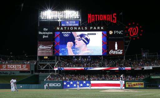 The scoreboard replays the United States' Katie Ledecky celebrating after she won gold in the women's 800-meter freestyle at the Summer Olympics, during the seventh inning of a baseball game between the Washington Nationals and the Atlanta Braves at Nationals Park, Friday, Aug. 12, 2016, in Washington. The Braves won 8-5. (AP Photo/Alex Brandon) The Associated Press