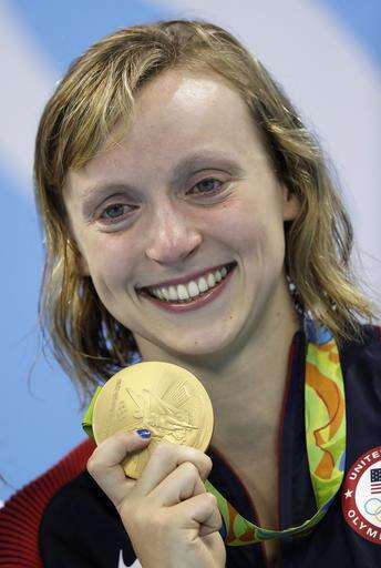Unites States' Katie Ledecky celebrates after winning gold in the women's 800-meter freestyle final during the swimming competitions at the 2016 Summer Olympics, Friday, Aug. 12, 2016, in Rio de Janeiro, Brazil. (AP Photo/Julio Cortez) The Associated Press