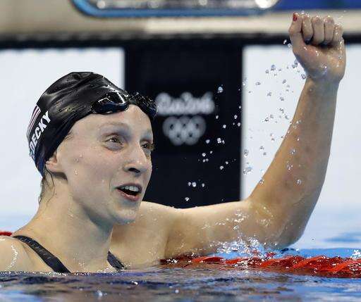 United States' Katie Ledecky celebrates after the women's 800-meter freestyle final during the swimming competitions at the 2016 Summer Olympics, Friday, Aug. 12, 2016, in Rio de Janeiro, Brazil. (AP Photo/Michael Sohn) The Associated Press