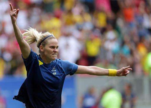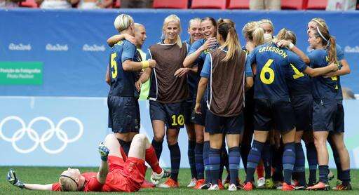 Sweden's players celebrate after a quarter-final match of the women's Olympic football tournament between the United States and Sweden in Brasilia Friday Aug. 12, 2016. The United States was eliminated by after a penalty shoot-out.(AP Photo/Eraldo Peres) The Associated Press