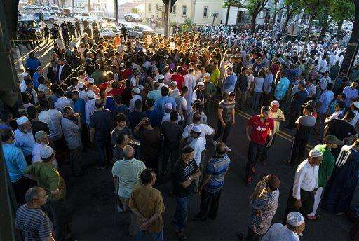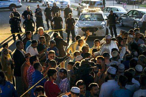 In this Saturday, Aug. 13, 2016, photo, people gather near a crime scene for a demonstration after the leader of a New York City mosque and an associate were fatally shot in a brazen daylight attack as they left afternoon prayers Saturday. Police said 55-year-old Imam Maulama Akonjee and his 64-year-old associate, Tharam Uddin, were shot in the back of the head as they left the Al-Furqan Jame Masjid mosque in the Ozone Park section of Queens shortly before 2 p.m. (AP Photo/Craig Ruttle)