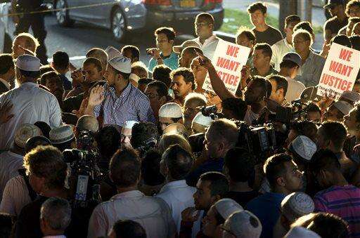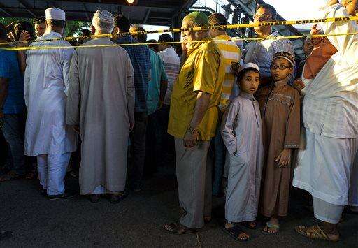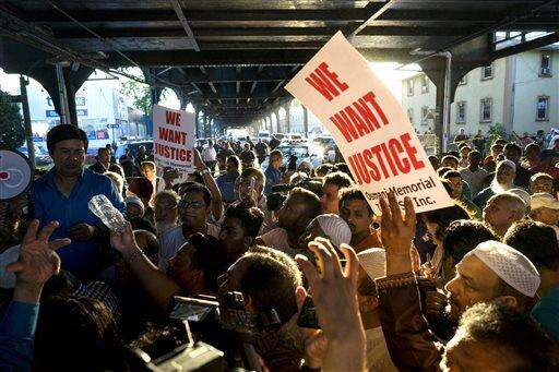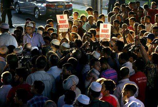 People gather for a demonstration Saturday, Aug. 13, 2016, in the Queens borough of New York, near a crime scene after the leader of a New York City mosque and an associate were fatally shot as they left afternoon prayers. Police said 55-year-old Imam Maulama Akonjee and his 64-year-old associate, Tharam Uddin, were shot as they left the Al-Furqan Jame Masjid mosque. (AP Photo/Craig Ruttle)