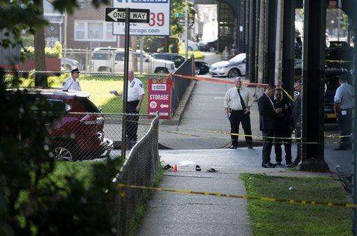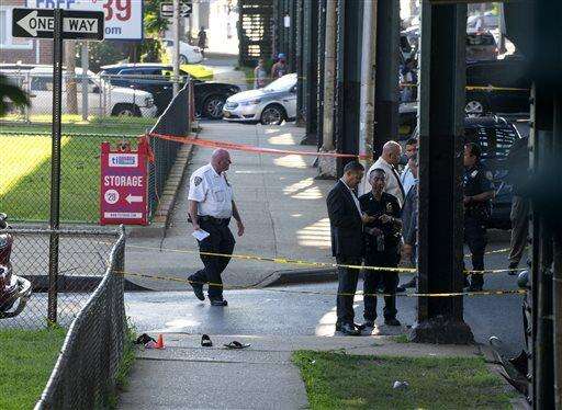 Sandals lay on a street corner at the crime scene, Saturday, Aug. 13, 2016, not far from the Al-Furqan Jame Masjid Mosque in the Ozone Park neighborhood of Queens, New York, where the leader of a New York City mosque has been fatally shot and an associate has been wounded in a brazen daylight attack. (AP Photo/Craig Ruttle)