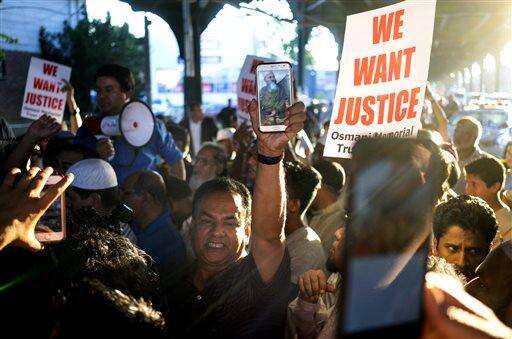 People gather for a demonstration Saturday, Aug. 13, 2016, near a crime scene after an imam and his friend were fatally shot while walking home from a mosque. Police said 55-year-old Imam Maulama Akonjee and his 64-year-old associate, Tharam Uddin, were shot in the back of the head as they left the Al-Furqan Jame Masjid mosque in the Ozone Park section of Queens. (AP Photo/Craig Ruttle)