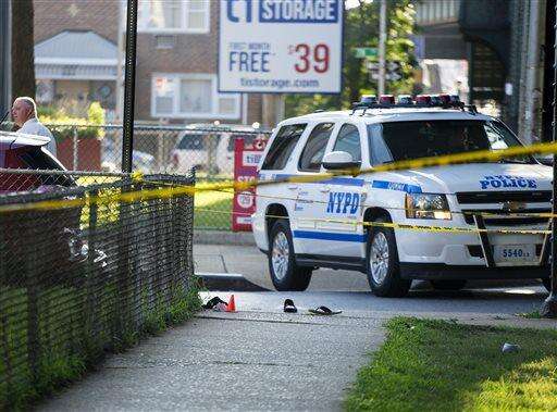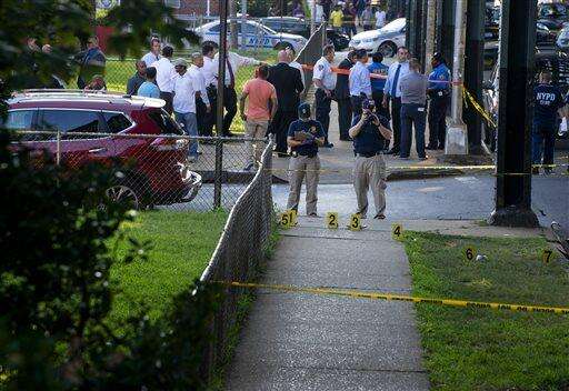 New York City police secure the scene where two men were shot as they left prayers at a mosque in the Queens borough of New York, Saturday, Aug. 13, 2016. Police identified the victims as Imam Maulama Akonjee, the 55-year-old leader of the mosque, who died at the hospital, and a 64-year-old man. (AP Photo/Jennifer Peltz)