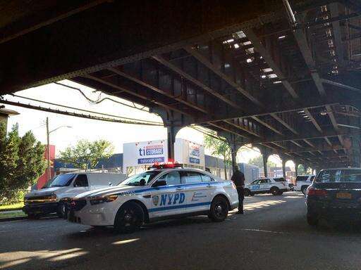 A young woman looks over the area from the steps of an elevated train station Saturday, Aug. 13, 2016, in the Queens borough of New York, near a crime scene after the leader of a New York City mosque and an associate were fatally shot as they left afternoon prayers. Police said 55-year-old Imam Maulama Akonjee and his 64-year-old associate, Tharam Uddin, were shot as they left the Al-Furqan Jame Masjid mosque. (AP Photo/Craig Ruttle)