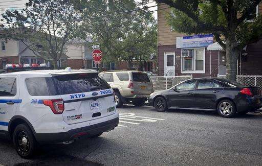A police vehicle is parked across the street from the Al-Furqan Jame Masjid mosque, Sunday, Aug. 14, 2016, in the Ozone Park section of the Queens borough of New York. The leader of the mosque, Imam Maulama Akonjee, 55, and an associate, Tharam Uddin, 64, were fatally shot as they left afternoon prayers Saturday. (AP Photo/Mike Balsamo)