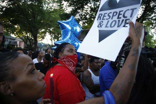Some two dozen officers in riot gear confronted about 150 people who blocked an intersection near where the black man was fatally shot Saturday afternoon, and more arrived. Police moved in to try to disperse the crowd and warned of arrests after protesters threw bottles and rocks at police.