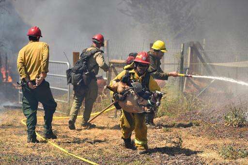 Milloy said the fire was chewing through bone-dry brush and oak trees weakened by California's years-long drought. Firefighters battled the flames as temperatures soared to 104 degrees.