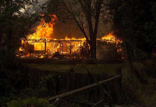 About 4,000 people have fled their homes as a growing wildfire in Northern California burns into a town and destroys at least 10 homes.