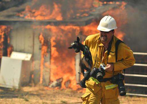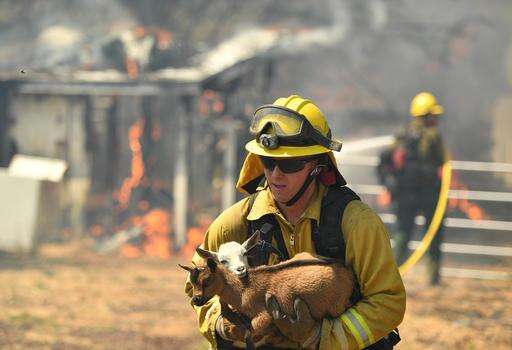 Firefighters and volunteers are carrying two goats at a time and taking them out of the area where tractors and utility poles are burning and bumpers are melting off cars as heavy smoke darkens the sky.