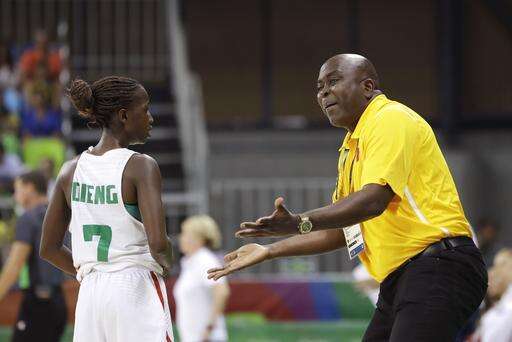 Senegal head coach Moustapha Gaye talks to guard Fatou Dieng during the first half of a women's basketball game against Serbia at the Youth Center at the 2016 Summer Olympics in Rio de Janeiro, Brazil, Sunday, Aug. 14, 2016. (AP Photo/Carlos Osorio)