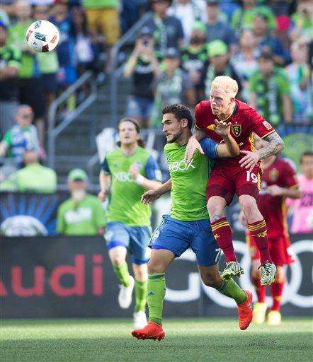 Real Salt Lake midfielder Luke Mulholland gets the header over Seattle Sounders midfielder Cristian Roldan during the second half of an MLS soccer match Sunday, Aug. 14, 2016, in Seattle. (Lindsay Wasson/The Seattle Times via AP) The Associated Press