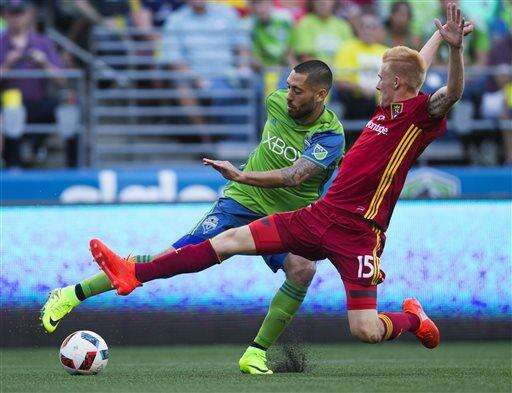 Real Salt Lake defender Justen Glad. tohjy.dives for the ball against Seattle Sounders forward Clint Dempsey during the second half of an MLS soccer match Sunday, Aug. 14, 2016, in Seattle. Seattle won 2-1. (Lindsay Wasson/The Seattle Times via AP) The Associated Press